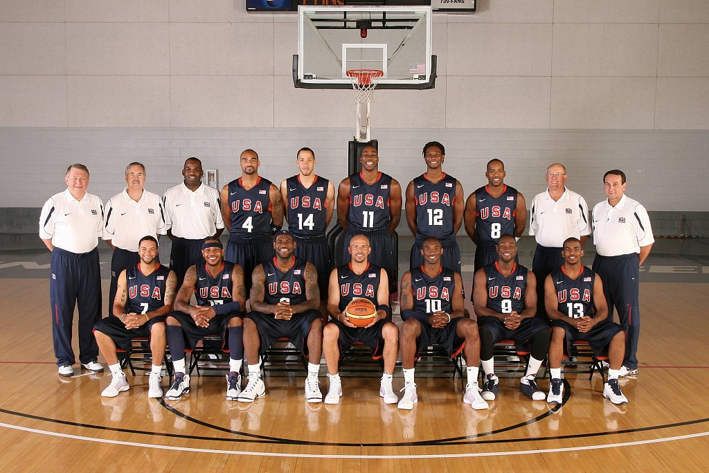 2008年美国男篮大名单:保罗、波什、霍华德、科比、韦德、里德、德隆、詹姆斯、基德、布泽尔、安东尼、泰肖恩-普林斯,教练则是老K(迈克-沙舍夫斯基)。
