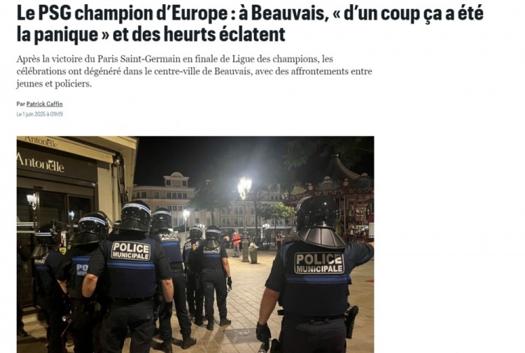 在欧冠决赛中,巴黎圣日耳曼5-0大胜国米,成功夺冠。巴黎圣日耳曼的球迷们在法国各地庆祝,但在博韦却发生了球迷骚乱。当时一群球迷先是欢呼夺冠,然后开始侮辱马赛人,并来到阿歇特广场。而在拉法耶百货附近,有大约20名防暴警察拿着盾牌维持秩序,之后局势突然变得紧张。