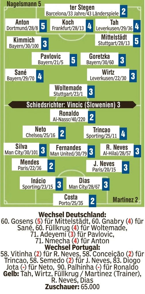 6月5日讯 今天凌晨,德国1-2不敌葡萄牙,无缘欧国联决赛,《图片报》赛后给两队球员进行了评分。