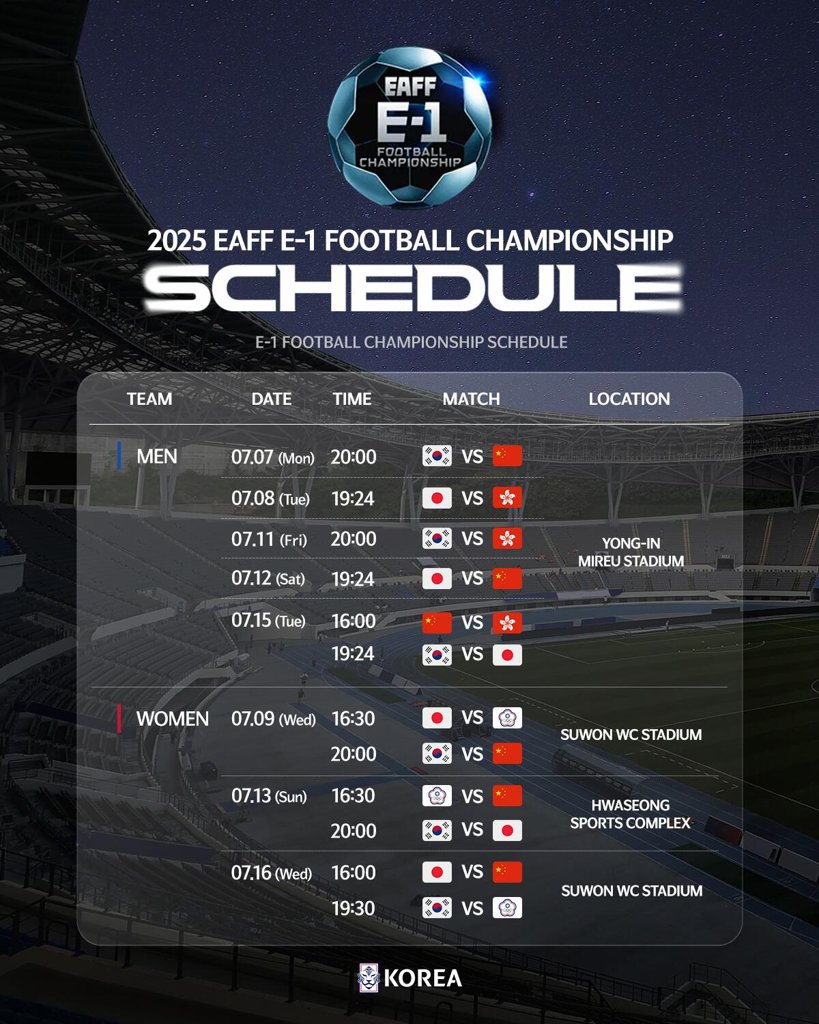 7月7日19:00,韩国vs中国(龙仁Mireu体育场)