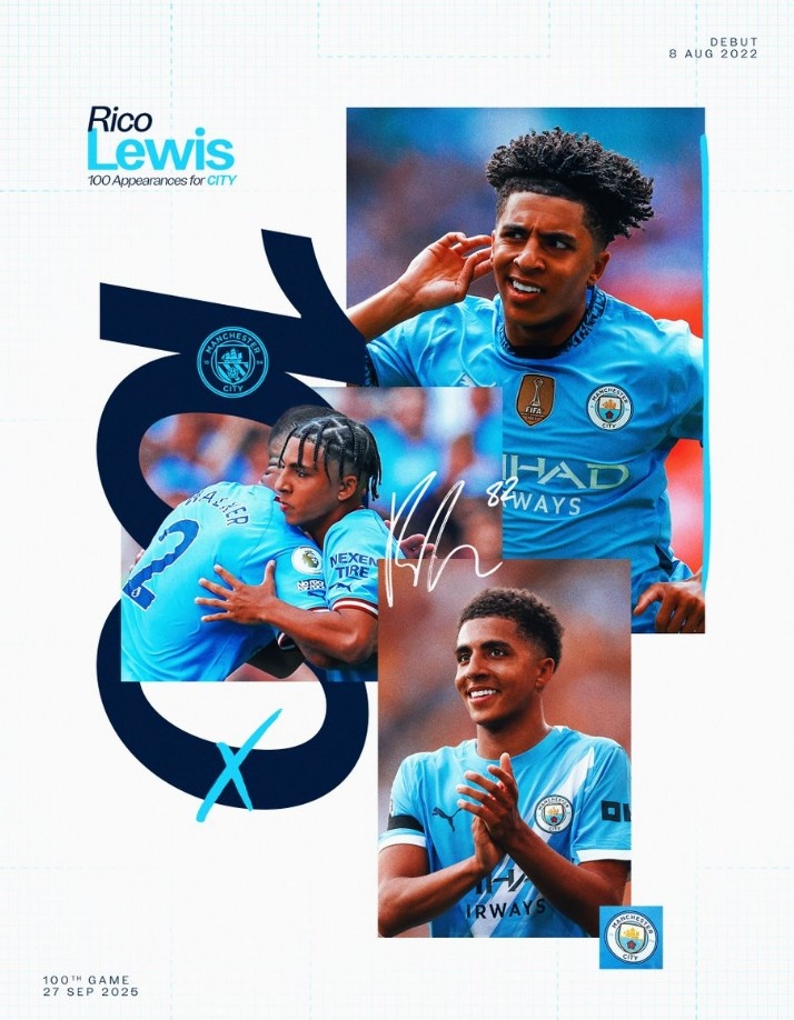 本队青训球员21岁前出场达到100次,刘易斯是英超时代曼城第三人