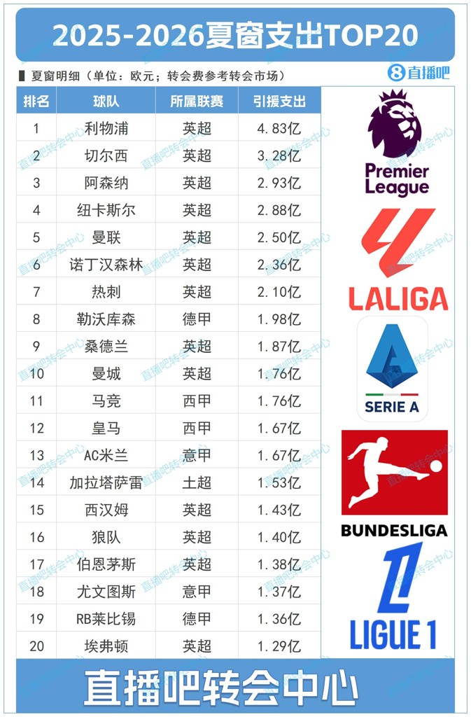 英钞!夏窗TOP20支出:利物浦4.83亿 英超刷屏前十占9席!药厂第8