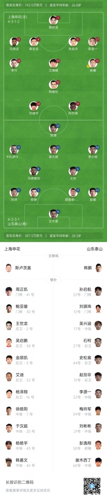 申花vs泰山首发:李可、吴曦、李小恒、彭啸先发,克雷桑泽卡伤缺