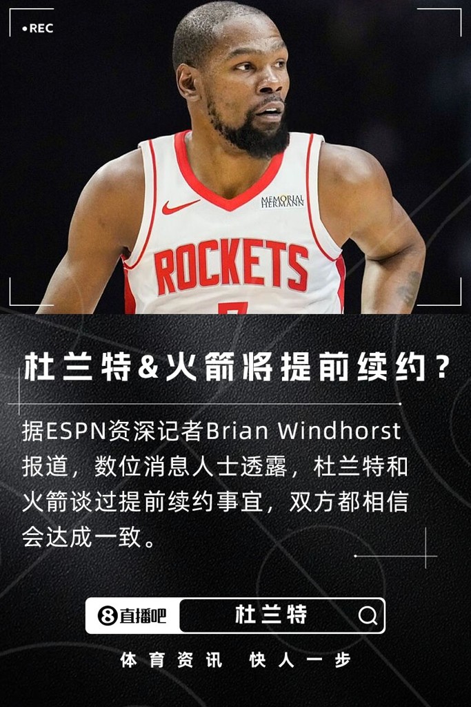 08月23日讯 ESPN资深记者Brian Windhorst近日撰文,谈到杜兰特和火箭提前续约的前景。具体如下: