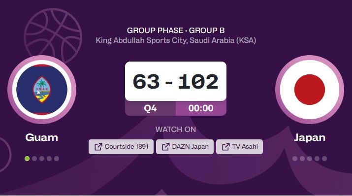 日本男篮39分大胜关岛锁定B组前2 确定不会和中国男篮1/4决赛遭遇